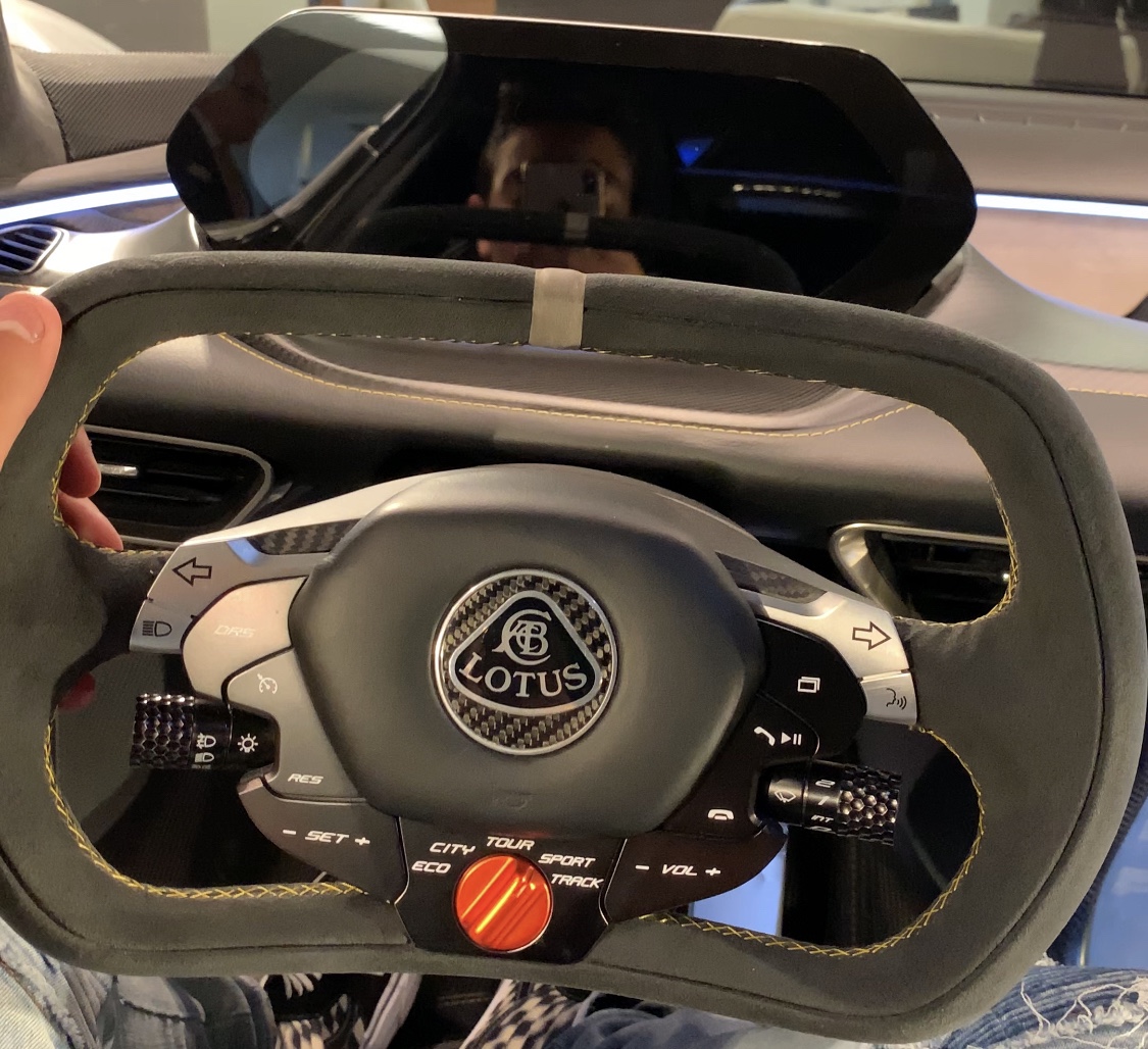 Onto the interior. There is an unbelievable sense of simplicity while still being practical. The center console is perfectly laid out, with all the buttons on a seamless gloss black piece with an interesting pattern. The gauge cluster is one big hexagonal shaped screen. The steering wheel is reminiscent of those in Formula 1, being a small rectangular shape with many high quality components.